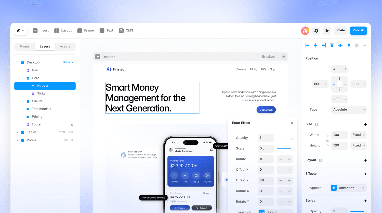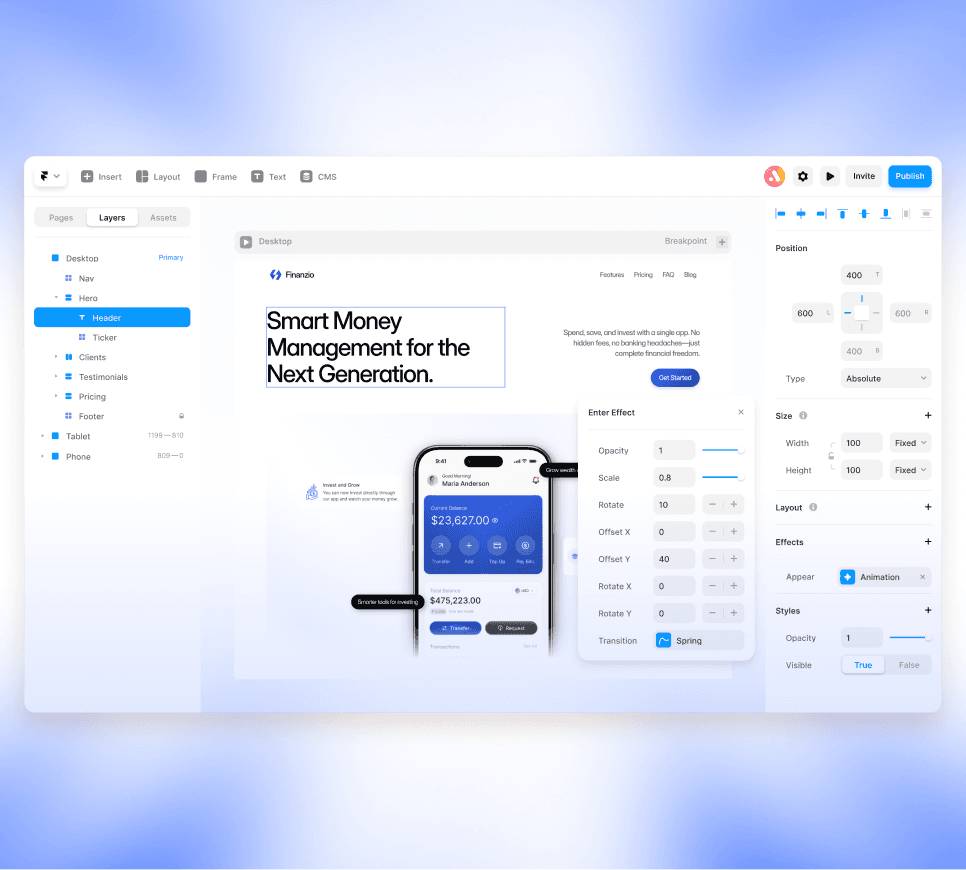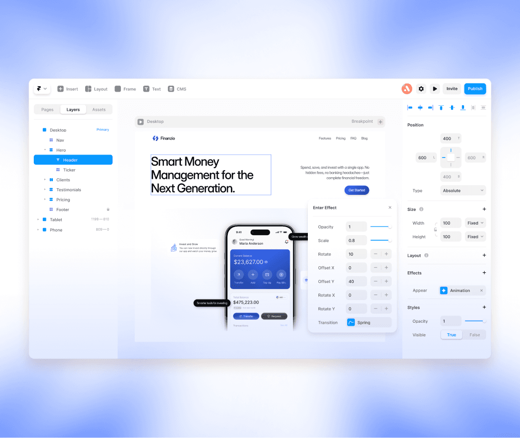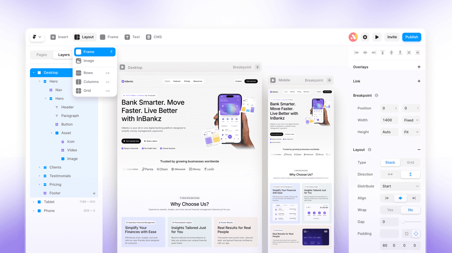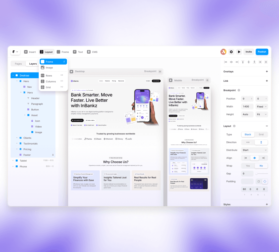 InBankz is a high-converting fintech experience that transforms financial data into clear, actionable insights with smart dashboards and seamless workflows, designed in Figma and built in Framer for performance and scale.